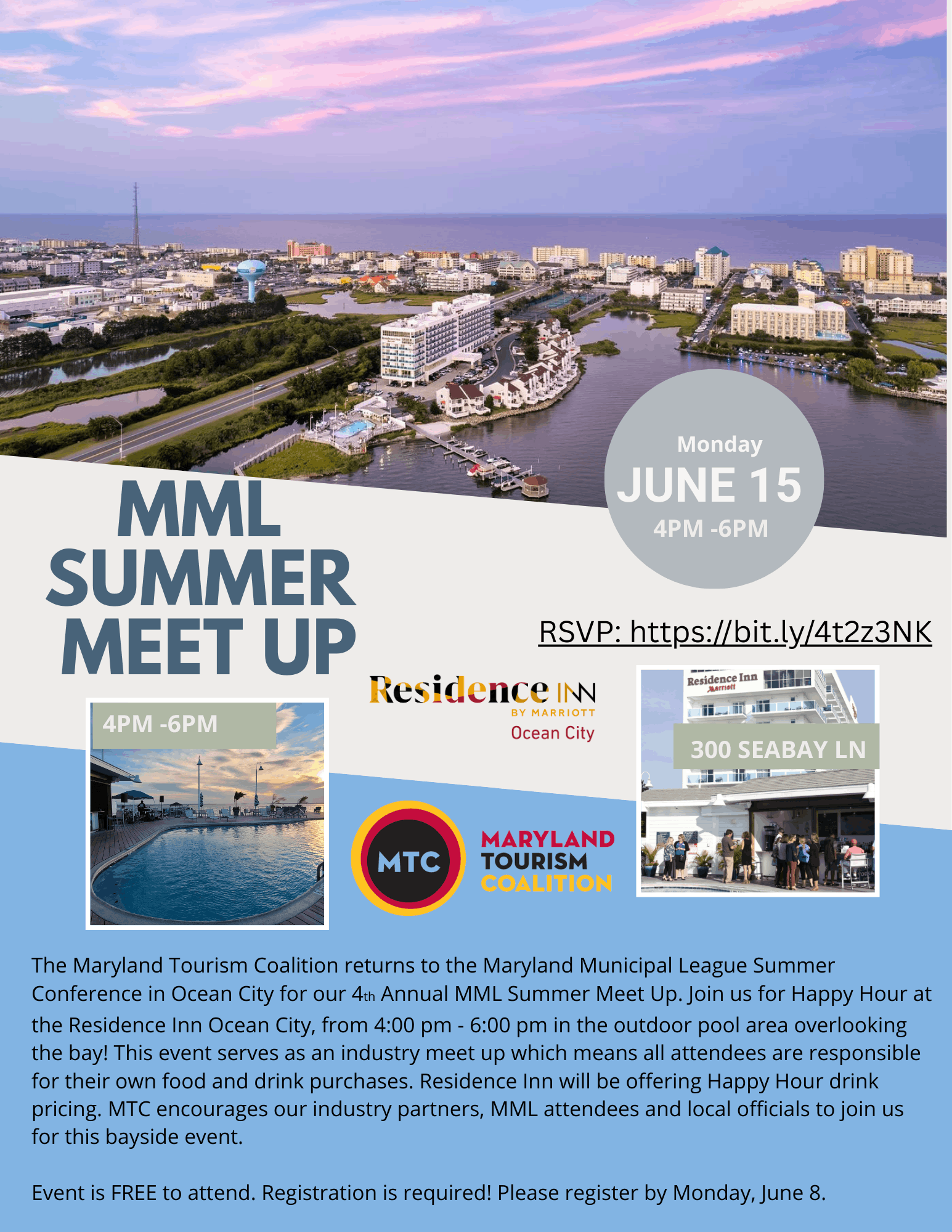 The Maryland Tourism Coalition returns to the Maryland Municipal League Summer Conference in Ocean City for our 4th Annual MML Summer Meet Up. Join us for Happy Hour at the Residence Inn Ocean City, from 4:00 pm – 6:00 pm in the outdoor pool area overlooking the bay! This event serves as an industry meet up which means all attendees are responsible for their own food and drink purchases. Residence Inn will be offering Happy Hour drink pricing. MTC encourages our industry partners, MML attendees and local officials to join us for this bayside event.
