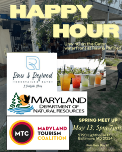 The Maryland Tourism Coalition and the Maryland Department of Natural Resources invite you to join us for a Spring Industry Meet Up on Wednesday, May 13, from 5 pm-7 pm at Raw & Refined, located on the Canton Waterfront. These events are for members to reconnect, new members to meet fellow MTC members and our Board members and for MTC to meet potential new members. We invite local businesses who would like to grow their business in the hospitality industry to join us to learn more about what the Maryland Tourism Coalition has to offer and how to become a member.