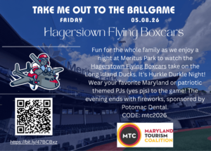 Fun for the whole family as we enjoy a night at Meritus Park to watch the Hagerstown Flying Boxcars take on the Long Island Ducks. It’s Hurkle Durkle Night! Wear your favorite Maryland or patriotic-themed PJs (yes pjs) to the game! The evening ends with fireworks, sponsored by Potomac Dental. Use the CODE: mtc2026 to get the discounted ticket rate.