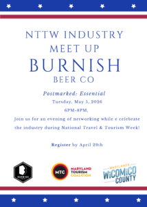 Join the Maryland Tourism Coalition as we celebrate National Travel & Tourism Week on Tuesday, May 5 from 6pm-8pm at Burnish Beer Company in Salisbury. This Industry Meet Up is in partnership with our friends at Wicomico County Tourism. Attendees will be responsible for their own food & beverage.